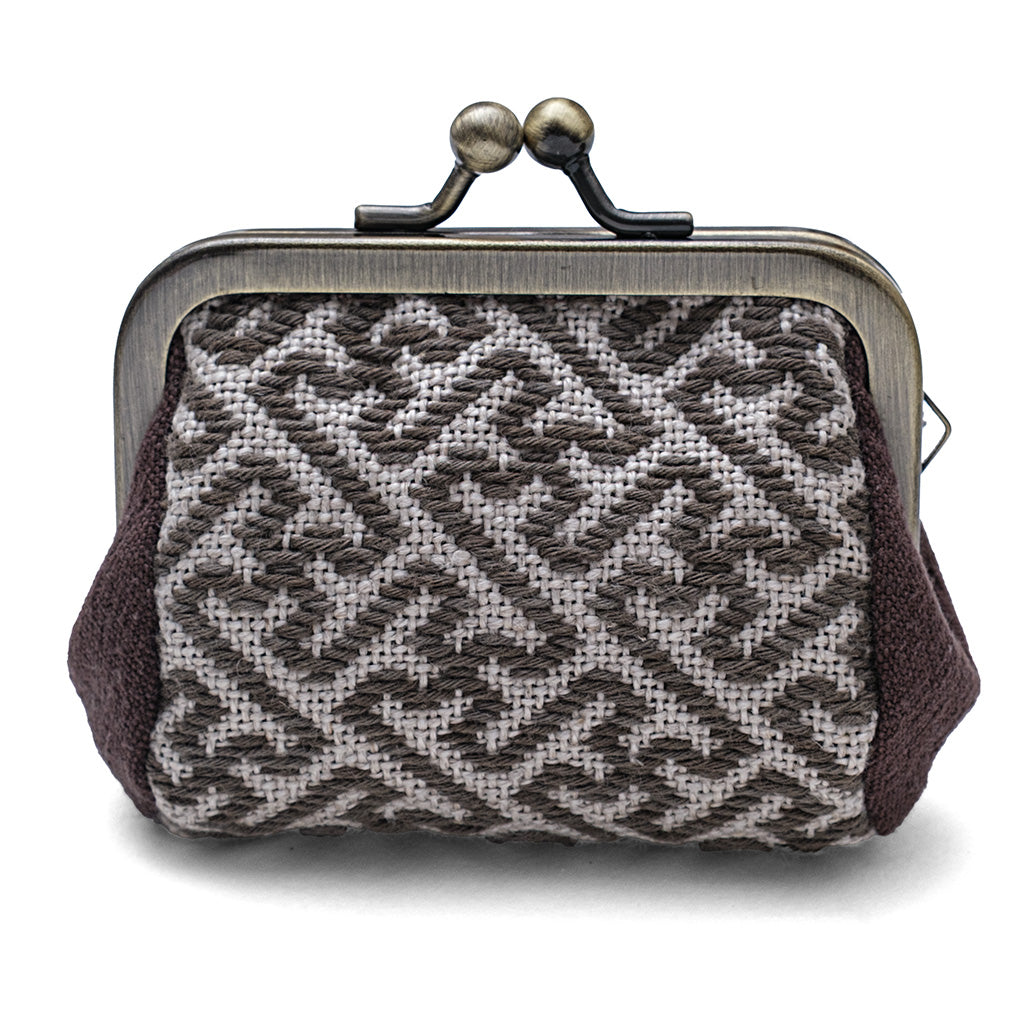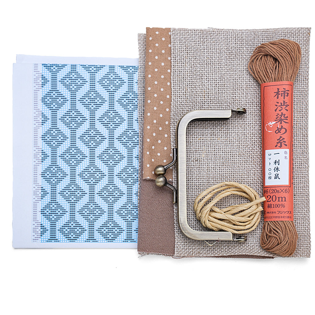 柿渋染(暮染)の糸とツバイガルト リネン刺繍布を使ったがま口です。生地、糸、がま口、作り方がセットになっています。図案は結び花の柱つなぎ、紗綾形の二種類が入っています。 こぎん針は入っていませんのでご用意ください。