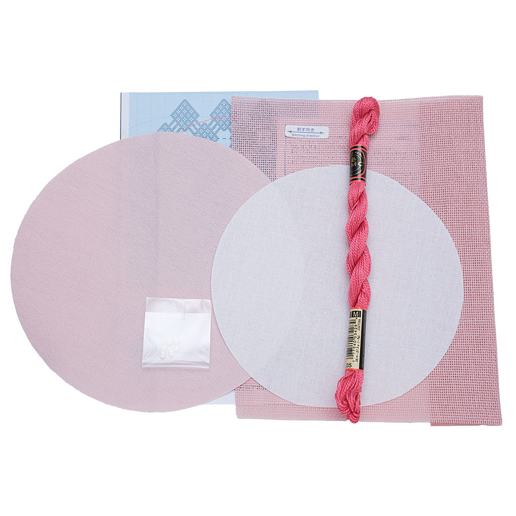 キット内容はこぎん布、こぎん糸、接着芯、裏布、ビーズです。接着芯はそのまま使えるように円形に裁断済みです。とても作りやすいキットになっています。