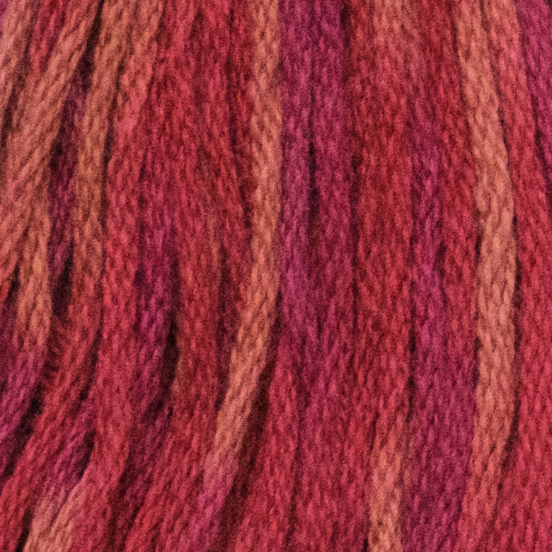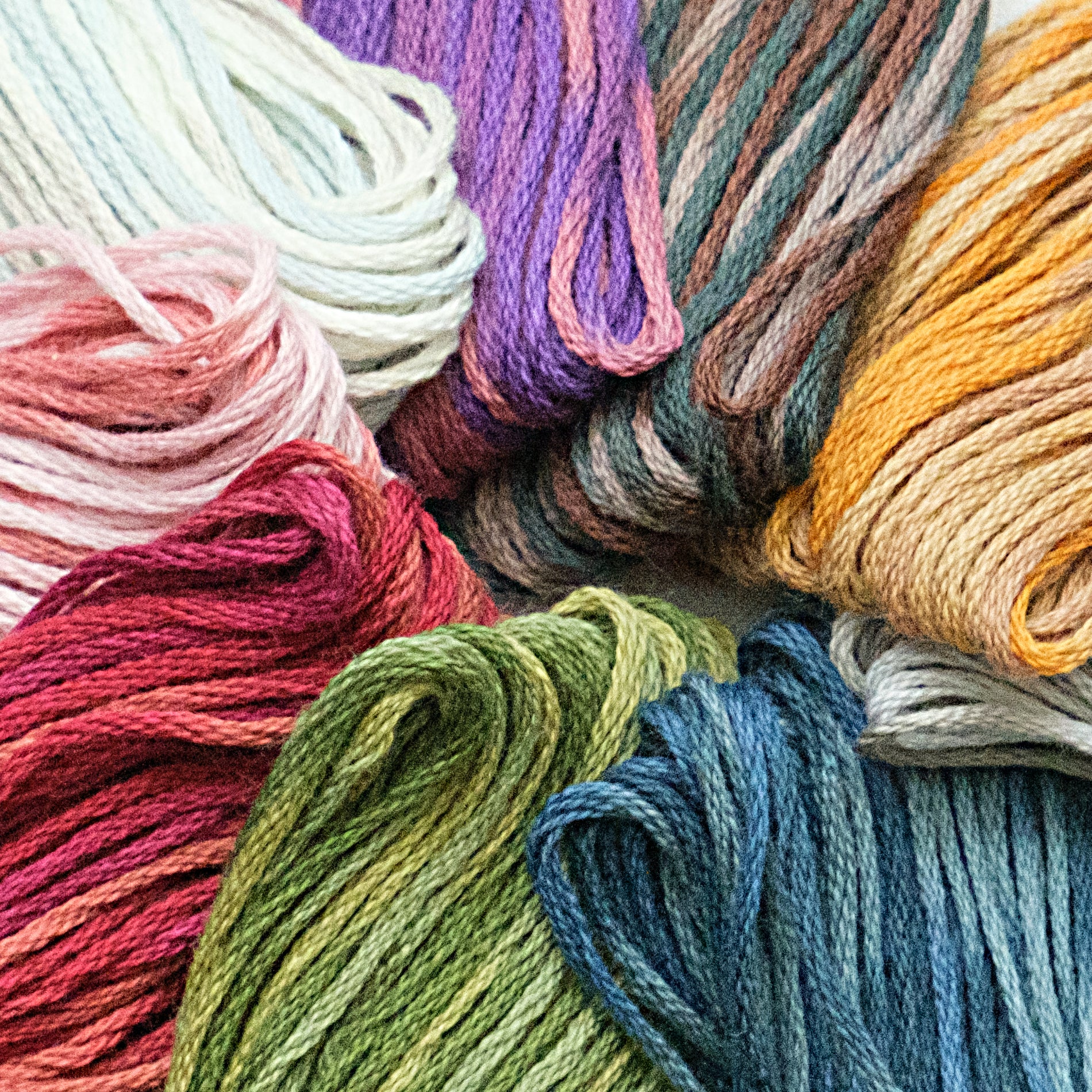 段染めの間隔が狭いのグラデーションなので小さな模様にも適しています。素朴で柔らかな風合いを大切にした6本撚りの糸です