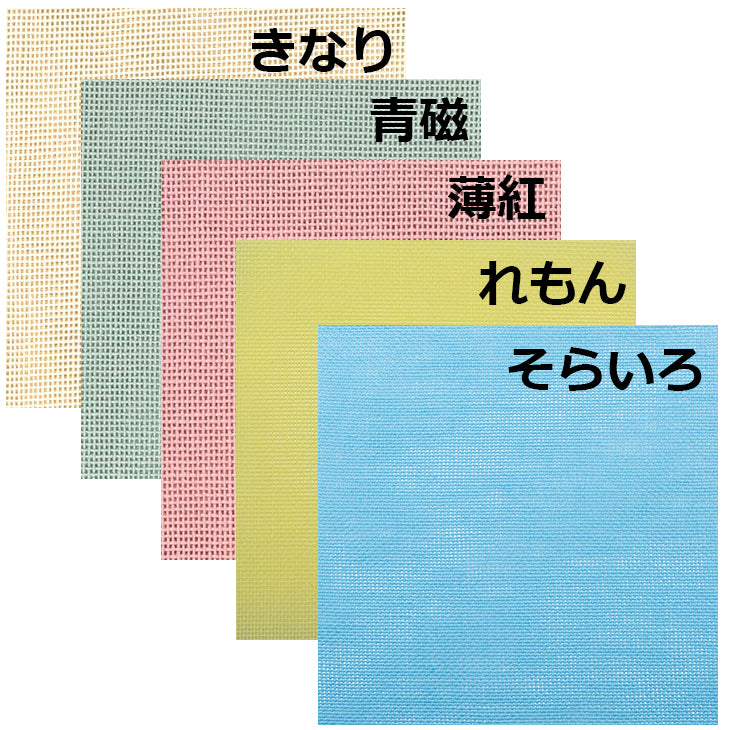 オリジナルの綿100%で国産のこぎん刺し用布ペリープルの明るい色を15x15cm にカットして5色セットにしました。1cm四方あたり横約8目、縦7目で刺すと伝統的なこぎん刺しのようにやや縦長の模様にしあがります。セットの色はきなり、青磁、薄紅、れもん、そらいろです。
