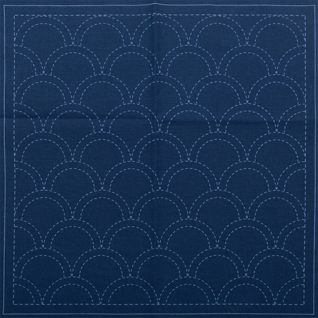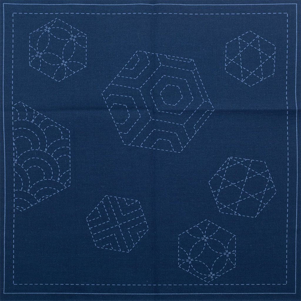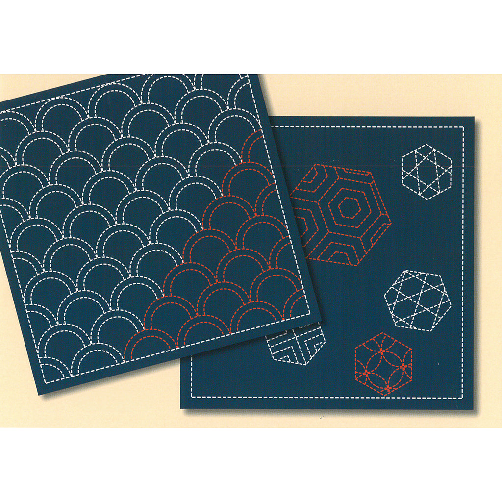約33cm x 33cm の2種類の柄がプリントされています。お好みの1柄を刺してもう1柄を水で消して裏地として使うもよし、1柄ずつをぞれぞれ刺してお好みの裏地を用意していただければ2種類の花ふきんが作れます。刺しやすい晒木綿、綿100%です。刺し終えた後に水で洗うと図案は消えますので、全て刺さずにお好みの部分だけ刺してあとは消してしまえば完成します。