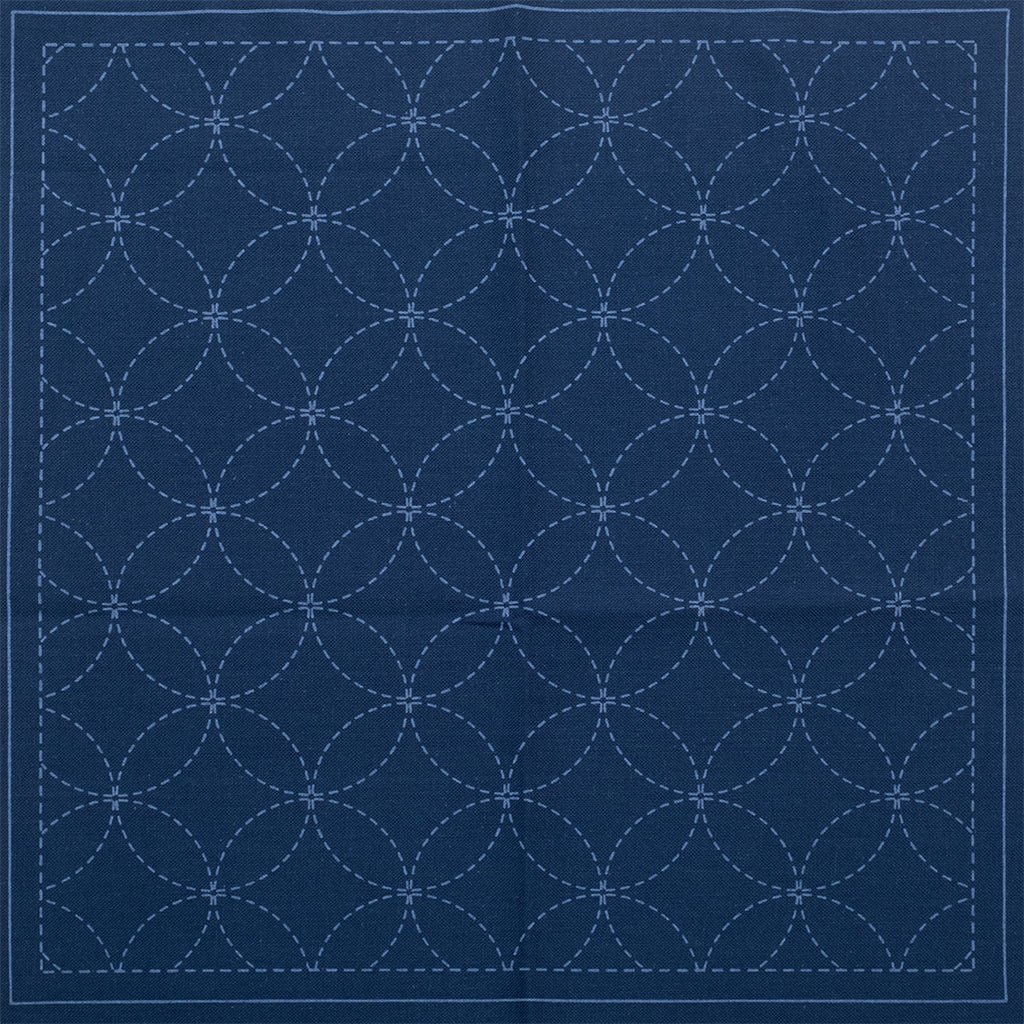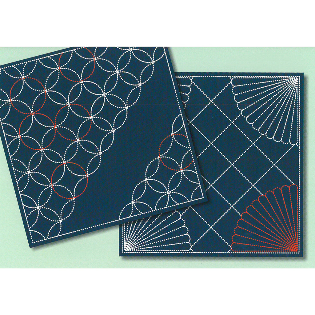 約33cm x 33cm の2種類の柄がプリントされています。お好みの1柄を刺してもう1柄を水で消して裏地として使うもよし、1柄ずつをぞれぞれ刺してお好みの裏地を用意していただければ2種類の花ふきんが作れます。刺しやすい晒木綿、綿100%です。刺し終えた後に水で洗うと図案は消えますので、全て刺さずにお好みの部分だけ刺してあとは消してしまえば完成します。